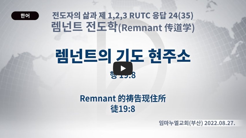 ▷ 렘넌트의 기도 현주소(행 19:8). 바울은 답을 가지고 전한 것이다. “석 달 동안 하나님의 나라에 대해 얘기했다.”라고 했다. 복음이 실제 힘이 되고 기도가 되도 록 이야기한 것이다. ▣ 서론_