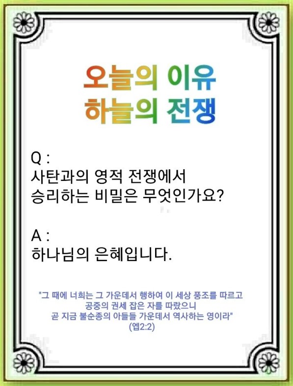 하나님은 세상이 줄 수 없는 은혜를 우리에게 주셨습니다. 죄와 허물로 죽었던 우리를 살리신 것입니다.(엡 2:1-7) 하나님의 은혜를 인하여 믿음으로 말미암아(엡 2:8-10) 구원을 받았습니다. 하나님은 우리에게 하나님 자녀의 신분과 싸울 수 있는 권세까지 주셨습니다.