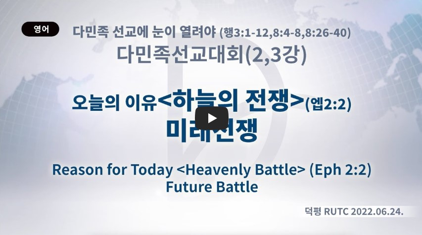 인터넷총국 (홈페이지 http://data.rutc.com) 후원: (국민은행) 856701-04-233309 (사)세계복음화전도협회 인터넷총국 분류 2022- 다민족 선교대회 제목 2강: 오늘의 이유- “하늘의 전쟁” 성경 에베소서 2:2