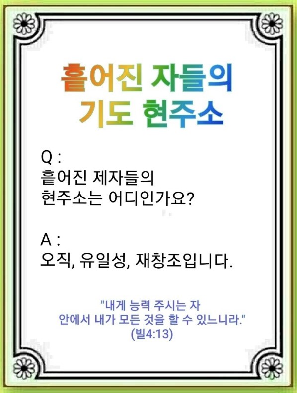 복음이 들어갈 수 없는 나라들이 있습니다. 그 나라에 들어갈 사람들이 흩어진 제자들입니다. 흩어진 자들의 현주소는 어디일까요? 쉽게 찾을 수 있습니다. 계속 질문하면 오직이 발견됩니다. 오직을 발견한 사람을 이길 수 없습니다. 이때 반드시 보이는 것이 있습니다. 유일성입니다. 그때부터는 재창조가 따라옵니다. 영적으로 보면 그리스도, 하나님의 나라, 오직 성령이라는 답이 나옵니다. 마가 다락방 사람들, 안디옥 사람들, 로마서 16장 사람들이 이것을 누린 것입니다. 이 사람들이 가진 것이 무엇이었을까요?