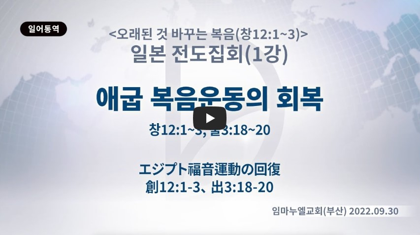 2023년 10월 2일 (월) 분류 2022- 일본전도집회 제목 1강: 애굽 복음운동의 회복 성경 출애굽기 3:18-20 일시/장소 2022년 10월 4일-5일, 임마누엘교회(부산-온라인) 설교 류광수 목사 (녹취정리: 차동호