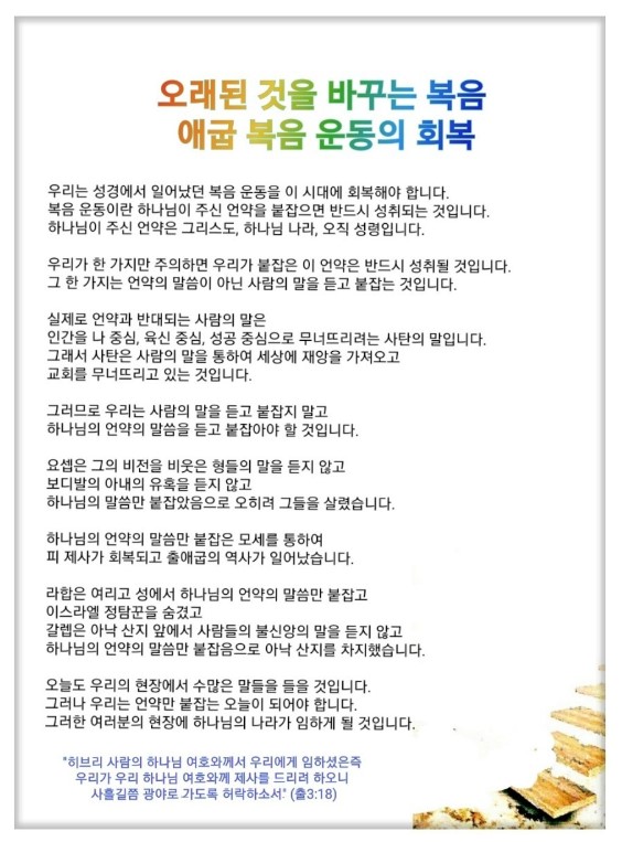 강대국 애굽에서 일어났던 복음운동을 회복해야 합니다. 이 운동은은 아브라함에게 약속되었던 것으로 요셉과 모세를 통해서 이루어졌습니다. 이처럼 우리가 붙잡은 언약은 반드시 성취됩니다. 성경은 지금도 계속되고 있는 창 3·6·11장 문제와 여기에 대한 답을 처음부터 알려 주었습니다. 그것이 행 1:1, 3, 8입니다. 우리가 사람의 말을 듣지 않고 하나님의 말씀만 누리면 무조건 역사가 일어납니다.(창 1:1-3, 요 1:1-14, 히 4:12, 겔 37:1-11) 그런데 우리는 100% 사람의 말에 붙잡혀 있습니다. 실제로는 전부 창 3·6·11장에서 나온 사탄의 말입니다. 이것이 세계화, 국가화, 개인화가 되어 전쟁과 재앙, 영적 문제를 끊임없이 일으키고 있습니다. 그 결과 우상, 종교가 일어나고 교회는 무너지고 있습니다. 우리가 언약만 마음에 담고 있으면 역사가 일어납니다.