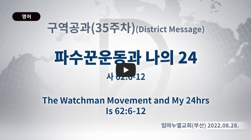 2023년 10월 5일 (목) 분류 구역공과- 2022년 35과 제목 파수꾼 운동과 나의 24 성경 이사야 62:6-12 일시/장소 2022년 8월 28일, 임마누엘교회(부산) 설교 류광수 목사 (녹취정리: 차동호 목사) 출처 (사)세