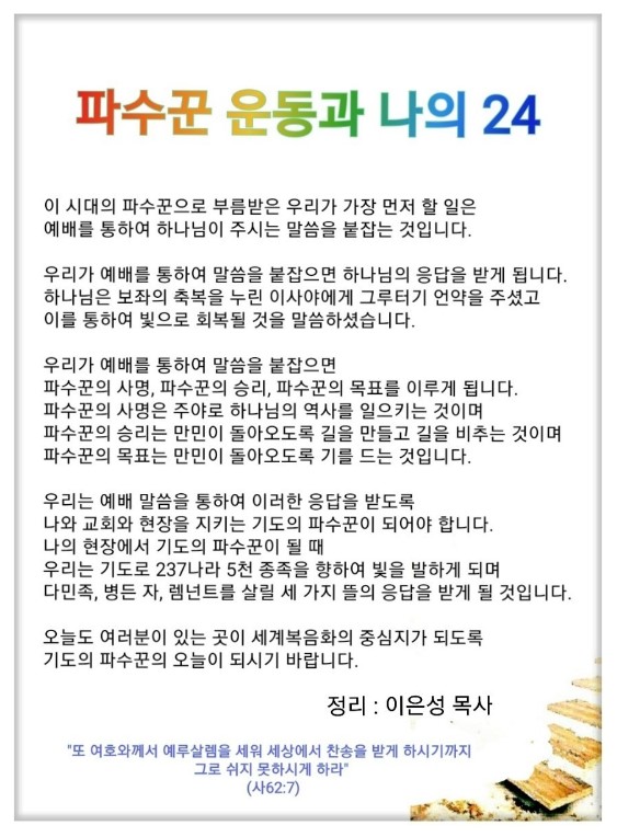 우리는 복음을 회복하고 누리고 전달하는 파수꾼입니다.(사 7:14, 임마누엘) 나와 교회와 현장을 지키는 기도의 파수꾼으로(사 62:6-12) 지금 있는 현장에서 237, 5천 종족을 향해서 빛을 발하는 것입니다.