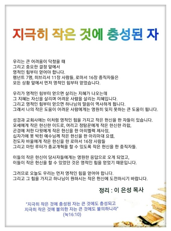 누가복음 16:1-13 / 지극히 작은 것에 충성된 자는 큰 것에도 충성되고 지극히 작은 것에 불의한 자는 큰 것에도 불의하니라 (10)