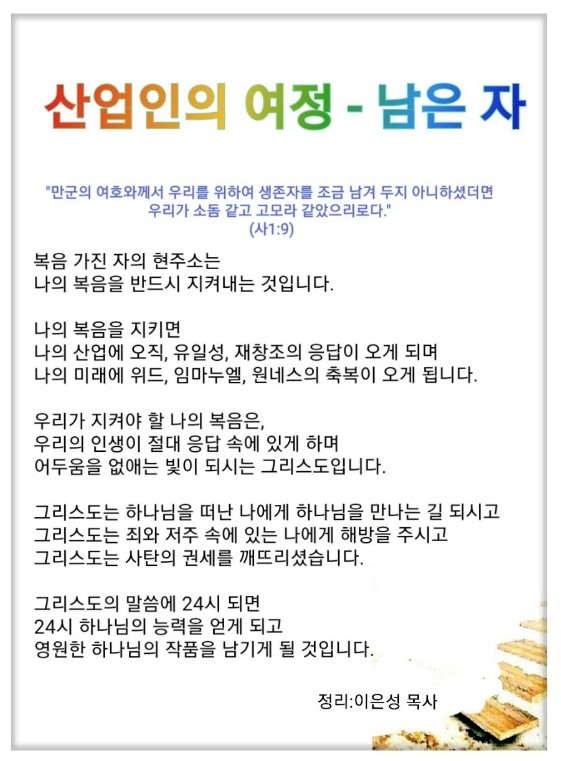 [언약 기도] 하나님께 감사드립니다. 복음 가진 산업인들이 올바른 현주소를 누리며 평생에 하나님의 절대 것을 발견하는 생명운동하게 하옵소서. 약속하신 빛 가운데 거하며 그 빛을 전하는 남은 자, 남는 자, 남을 자, 남길 자로 인생 자체가 영원한 작품 되게 하옵소서. 예수 그리스도 이름으로 기도하옵나이다. 아멘.
