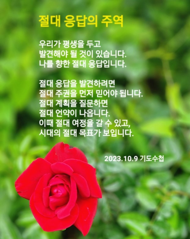 우리가 평생을 두고 발견해야 될 것이 있습니다. 나를 향한 절대 응답입니다. 절대 응답은 어디든지 있습니다. 그리고 절대 주권을 먼저 믿어야 됩니다. 절대 계획을 질문하면 절대 언약이 나옵니다. 이때 절대 여정을 갈 수 있고, 시대의 절대 목표가 보입니다. 이것이 생명운동입니다.