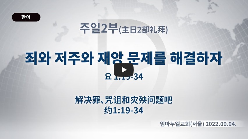 2023년 10월 16일 (월) 분류 주일예배 설교- 주일2부 제목 죄와 저주와 재앙 문제를 해결하자 성경 요한복음 1:19-34 일시/장소 2022년 9월 4일, 임마누엘교회(서울) 설교 류광수 목사 (녹취정리: 차동