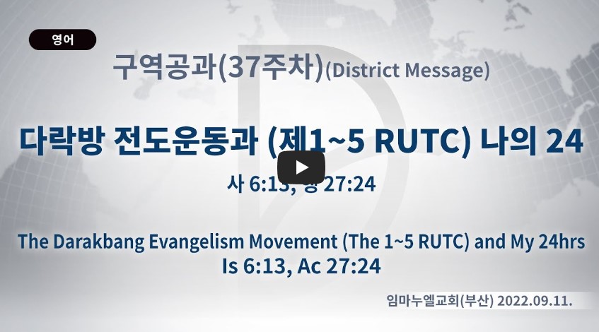2023년 10월 17일 (화) 분류 구역공과- 2022년 37과 제목 다락방 전도운동(제1-5RUTC)과 나의 24 성경 이사야6:13, 사도행전27:24 일시/장소 2022년 9월 11일, 임마누엘교회(부산) 설교 류광수 목사 (녹취정리