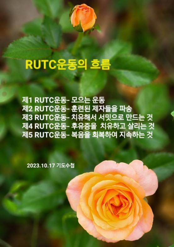 제1 RUTC운동은 모으는 운동입니다. 제2 RUTC운동은 훈련된 제자들을 파송하는 것입니다. 제3 RUTC운동은 치유해서 서밋으로 만드는 것입니다. 제4 RUTC운동은 복음 없는 유대인과 3단체 때문에 오게 될 굉장한 영적 문제를 치유하고 살리는 것입니다. 제5 RUTC운동은 없어지는 복음을 회복하여 지속하는 것입니다.