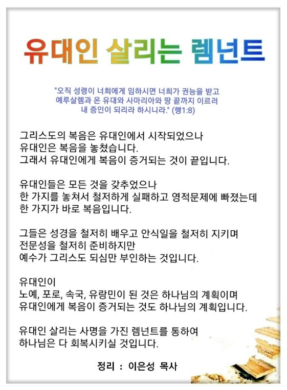 렘넌트들은 공부할 때 기준을 모든 사람을 살리는 데 두어야 합니다. 특히 유대인에 주목해야 합니다. 유대인이 우리의 땅끝입니다. 유대인에게서 시작된 복음을 유대인이 놓쳤습니다. 그래서 유대인에게 증거하는 것이 끝인 것입니다.