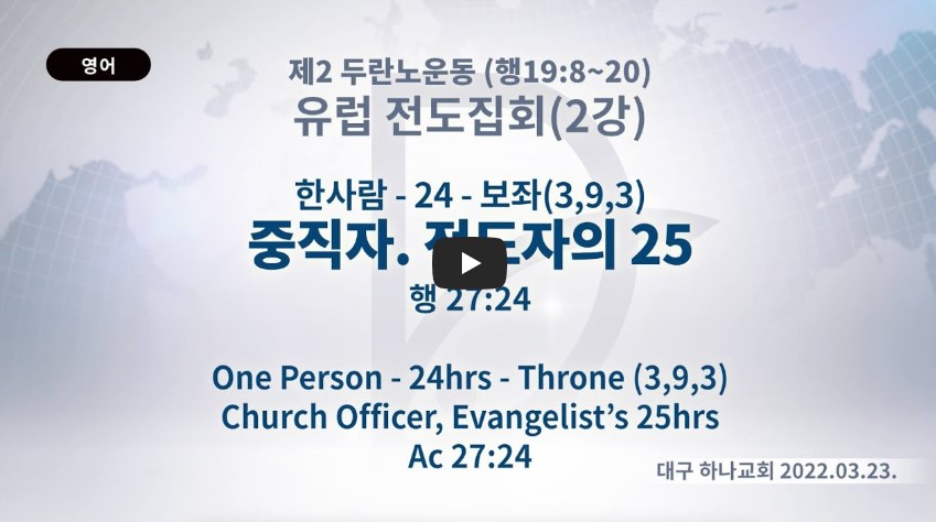 인터넷총국 (홈페이지 http://data.rutc.com) 후원: (국민은행) 856701-04-233309 (사)세계복음화전도협회 인터넷총국 분류 2022- 유럽 전도집회 제목 2강: 중직자, 전도자의 25시 성경 사도행전 27:24 일시/장