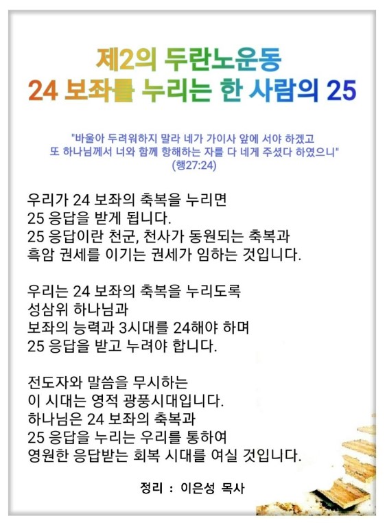 중직자와 전도자가 24 보좌의 축복을 누리면 반드시 25 응답을 받게 됩니다. 천군, 천사가 동원되는 축복이 오는 것입니다.(행 27:23-24) 그래서 하늘과 보좌의 축복이 어마어마한 권세와(Authority) 함께 내게 임하게 됩니다. 그러므로 3·9·3으로(보좌) 24 하는 것을 절대 놓치지 말아야 합니다. 그러면 반드시 25가 옵니다. 이 25 응답만 누리면 됩니다. 바울은 이 비밀을 알고 회당으로 들어가 하나님 나라에 관하여 담대히 강론했습니다. 바울처럼 24 보좌의 축복을 누리면 하나님의 여정이(행 19:21, 행 23:11, 행 27:24) 보입니다. 앞으로 영적 광풍 시대가 올 것입니다.