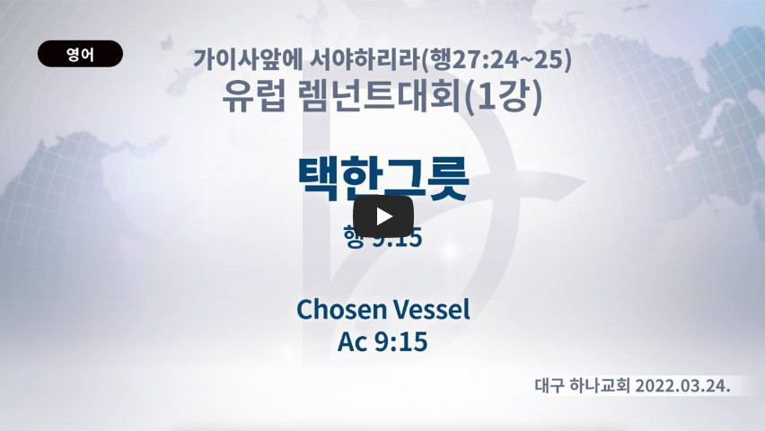 인터넷총국 (홈페이지 http://data.rutc.com) 후원: (국민은행) 856701-04-233309 (사)세계복음화전도협회 인터넷총국 분류 2022- 유럽 렘넌트대회 제목 1강: “택한 그릇” 성경 사도행전 9:15 일시/장소 2022