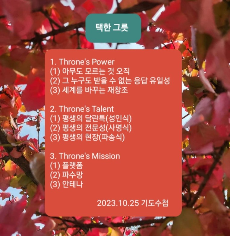 보좌에서 내리는 미션을 가지고 있으면 내가 플랫폼이 됩니다. 또한 사람들이 내게 와서 빛과 생명을 보게 됩니다. 그것이 파수망입니다. 나를 통해 메시지와 소통됩니다. 안테나가 되는 것입니다.