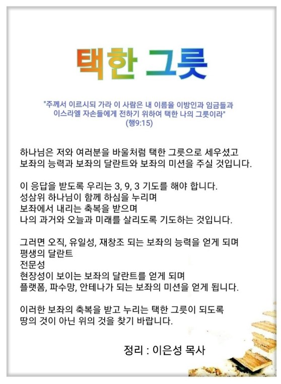 사도행전 9:15 / 주께서 이르시되 가라 이 사람은 내 이름을 이방인과 임금들과 이스라엘 자손들에게 전하기 위하여 택한 나의 그릇이라