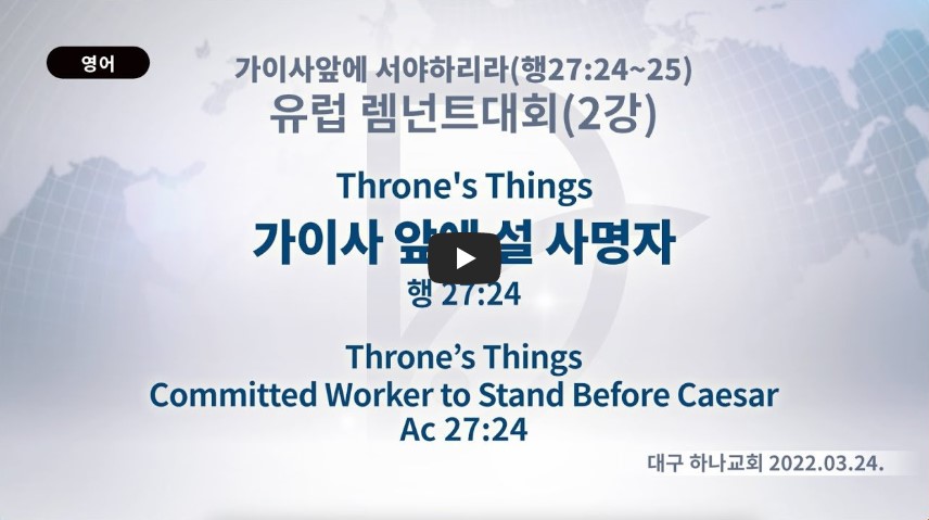 인터넷총국 (홈페이지 http://data.rutc.com) 후원: (국민은행) 856701-04-233309 (사)세계복음화전도협회 인터넷총국 분류 2022- 유럽 렘넌트대회 제목 2강: Throne's things - “가이사 앞에 설 사명자” 성경 사