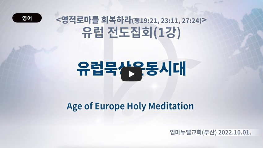 인터넷총국 (홈페이지 http://data.rutc.com) 후원: (국민은행) 856701-04-233309 (사)세계복음화전도협회 인터넷총국 분류 2022- 유럽 전도집회 제목 1강: 유럽 묵상운동 시대 성경 사도행전 19:21, 23:11, 27:24