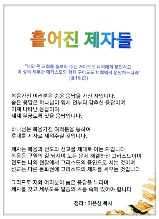 인터넷총국 (홈페이지 http://data.rutc.com) 후원: (국민은행) 856701-04-233309 (사)세계복음화전도협회 인터넷총국 분류 흩어진 제자들(2022-제123RUTC응답24)- 38 제목 RTS와 흩어진 제자들 성경 로마서 16:23