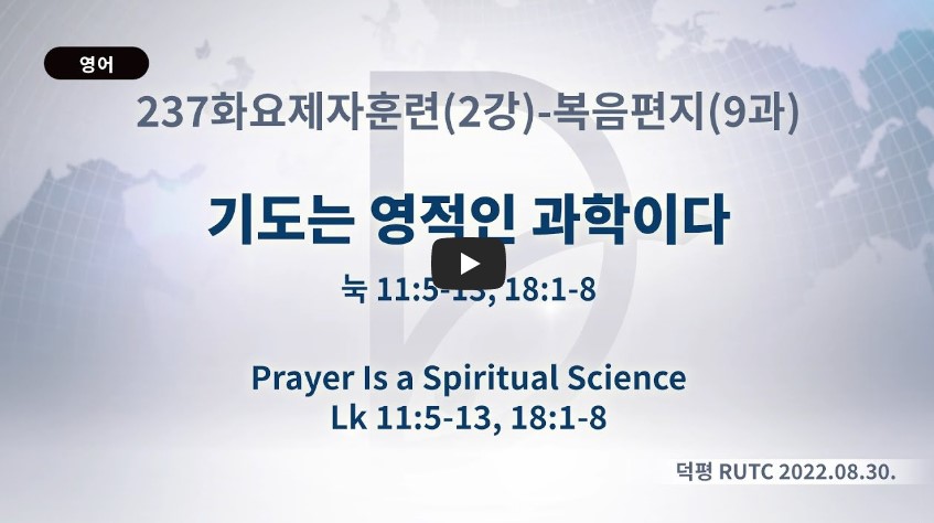 2022- 237화요제자 훈련(교재강의01- 복음편지8과) 제목 복음편지09과: 기도는 영적인 과학이다 성경 누가복음 11:5-13, 18:1-8 일시/장소 2022년 8월 30일, 덕평RUTC 설교 류광수 목사 (녹취정리: 차동호 목