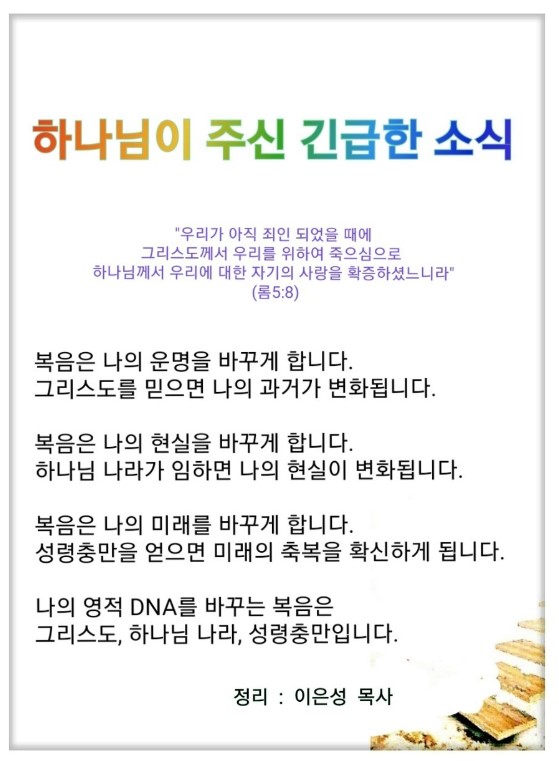 로마 시대 사람들은 긴급한 상황에 빠져 있었습니다. 매일 작고 큰 전쟁이 일어나서 떼죽음을 당했고, 아이들이 고아가 되었습니다. 이스라엘은 멸망 직전이었습니다. 곧 후대가 다 쫓겨나 유랑하면서 죽임을 당하게 될 것이었습니다. 그런데 이것을 전혀 모르고 있었습니다. 복음 없는 유대인이 복음 가진 소수에게 이단 누명을 씌워 죽이려 했습니다. 그 결과 로마와 이스라엘에 영적 문제가 심각해졌습니다. 정신병자가 가득하고, 후대는 긴급한 상황에 놓였습니다. 이것을 해결하기 위해 바울이 로마에 복음을 전달한 것입니다. 이때 바울이 롬 5:8을 고백했습니다. 이 말씀은 영적 DNA를 완전히 바꿔야 된다는 것입니다. 이를 위해 우리는 무엇을 세팅해야 될까요?