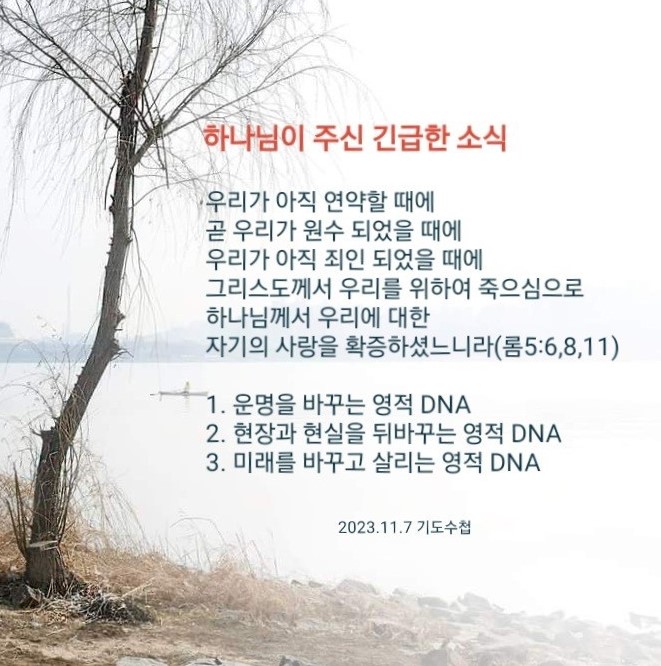 [언약 기도] 하나님께 감사드립니다. 오늘 모든 성도님들, 전국 세계에 있는 하나님의 사람들이 영적 DNA를 바꾸는 축복의 날이 되게 하옵소서. 전국 세계 흩어진 우리 렘넌트들에게 오늘 새 은혜를 입는 축복의 날이 되게 해 주옵소서. 어려움 당하는 자들, 많은 분들이 결단하는 날이, 답을 찾는 날이 되게 해 주옵소서. 예수 그리스도 이름으로 기도하옵나이다. 아멘.