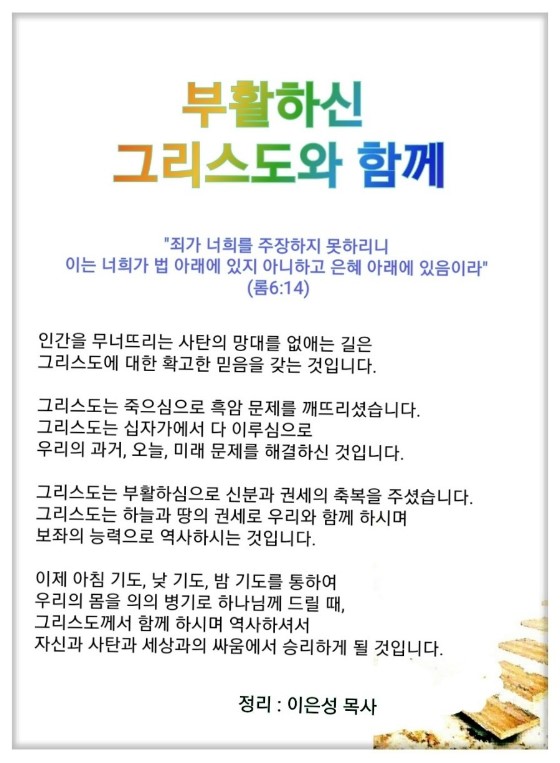 우리는 날마다 부활의 주를 만나는 시간을 가져야 됩니다. 아침에는 모든 스케줄 속에 있는 흑암의 망대를 무너뜨려야 됩니다. 낮에는 만나는 사람이 의의 병기를 가지고 흑암을 이기도록 도와줘야 됩니다. 밤에는 우리에게 있는 문제나 응답에 이 축복이 임하도록 기도하면 됩니다.