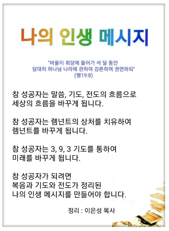 바울이 미래를 내다보고 회당으로 들어갔습니다. 거기서 로마를 뒤집을 지도자를 만들었습니다. 우리가 이 일을 하려면 먼저 나의 망대를 만들고, 나의 인생 메시지를 만들어야 합니다. 복음을 알면 천지개벽이 일어납니다. 기도를 알면 보좌의 능력이 나타납니다. 전도를 알면 시공간 초월이 일어납니다. 이 세 가지가 내게 정리되어 있어야 합니다. 그러려면 먼저 이 축복의 주인 되시는 하나님과 함께하는(WIO) 응답을 누려야 합니다. 이것이 나의 인생 메시지의 시작입니다. 그러면 오직·유일성·재창조 응답이 옵니다. 이때 기성세대와 현장 지도자가 전혀 알지 못하는, 하나님이 주신 것을 알고 전달하는 증인이 됩니다. 이것이 나와 교회, 현장을 살리는 인생 메시지입니다. 이 인생 메시지를 가지고 있으면 세상과 사탄, 강한 자, 괴롭히는 자, 교회 문제, 영적 문제 가진 자에게 속지 않습니다. 이때부터 세 가지를 바꾸는 참 성공자가 됩니다.