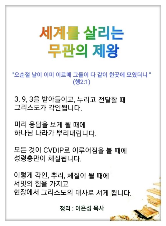 하나님은 2030~2080 시대를 살아갈 렘넌트들을 ‘세계 살리는 무관의 제왕’으로 세우셨습니다. 그래서 렘넌트는 달란트 준비만 하면 됩니다. 이 사실을 기도로 누릴 때 오는 응답이 있습니다. 첫째, 위에서 내리는 응답인 Heavenly Talent, Throne’s Talent입니다. 둘째, 렘넌트 7명이 왕에게 답을 주고, 재앙을 막아내고, 237을 살린 것과 같은 응답입니다. 마지막으로, 서밋 자세를 갖추게 됩니다. 근본(영적 상태), 기본(영적 축복), 기초가(영적 사실) 세워지는 것입니다. 그러면 말씀이 편집되고, 기도가 설계되며, 전도가 디자인되는 서밋 내용이 따라옵니다. “오순절 날이 이미 이르매”(행 2:1-4) 이 말씀은 세계를 장악하는 참된 왕의 능력을 의미합니다. 그러면 우리는 무엇을 해야 할까요?