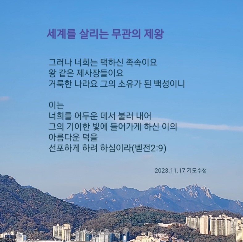 하나님께 감사드립니다. 분명히 세계 살릴 렘넌트 있음을 확신합니다. 우리 이번에 언약 잡는 시간이 되게 해 주옵소서. 세계를 살릴 참된 제왕으로 늘 기도를 누리게 하옵소서. 위에서 주신 달란트를 준비하게 하옵소서. 예수 그리스도의 이름으로 기도하옵나이다. 아멘.