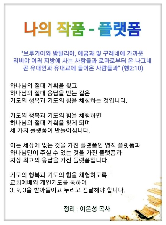 브리스가 부부는 바울을 도와 로마 복음화의 주역이 되었습니다. 이들처럼 응답받으려면 무엇을 해야 할까요? 우리를 향한 하나님의 절대 계획을 찾아야 합니다. 절대 계획을 찾지 못하는 이유는 기도의 행복과 기도의 힘을 실제로 모르기 때문입니다. 우리의 기도는 뇌에 각인되고 영혼 속에 파고들어 영원과 연결됩니다. 따라서 행복 속에서 힘을 얻는 24의 기도로 ‘나의 망대’를 만들어야 합니다. 기도 24가 되면 하나님의 나라인 25가 옵니다. 이때 보좌와 관계되는 영원이라는 응답이 옵니다. 이러면 성령의 내주와 성령 인도, 성령의 역사를 보게 됩니다. 이 속에서 성령 충만이라는 힘도 생기게 됩니다. 이때 절대 계획이 보이고, 세 가지 플랫폼이 만들어집니다.