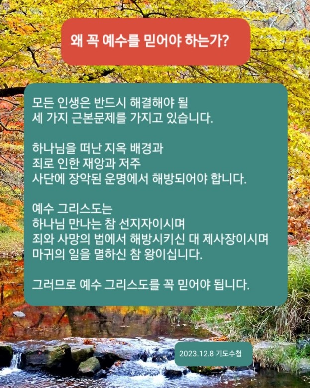하나님께 감사드립니다. 우리를 구원하신 것을 감사드립니다. 오직 예수를 믿어야 할 절대 이유를 아는 자 되게 하옵소서. 매일 그리스도로 충분하고 완전하며 모든 것으로 누려지게 하옵소서. 그래서 그리스도의 당위성을 전달하는 증인되게 하옵소서. 예수 그리스도 이름으로 기도하옵나이다. 아멘.