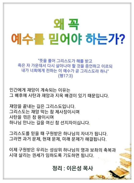 인간에게 재앙이 계속되고 있습니다. 그 배후에는 사탄과 지옥 배경이 있습니다. 그래서 그리스도면 끝입니다. 그리스도는 재앙 막는 참 제사장, 사탄을 꺾은 참 왕, 하나님 만나는 길을 여신 참 선지자이기 때문입니다. 예수를 믿어야 하는 10가지 이유를 알고 그리스도의 당위성을 전달해야겠습니다.