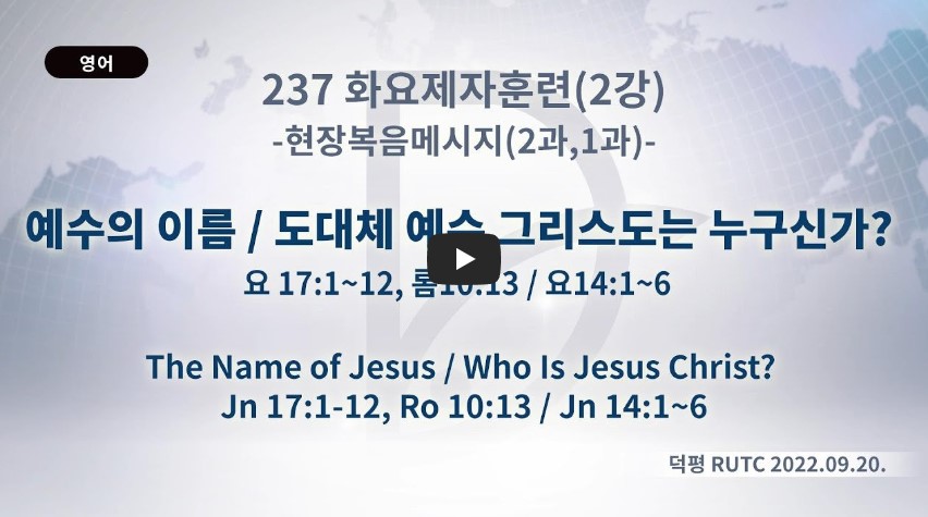 인터넷총국 (홈페이지 http://data.rutc.com) 후원: (국민은행) 856701-04-233309 (사)세계복음화전도협회 인터넷총국 분류 2022- 237화요제자훈련(교재강의02-현장복음메시지) 제목 현장복음메시지: 2과: “