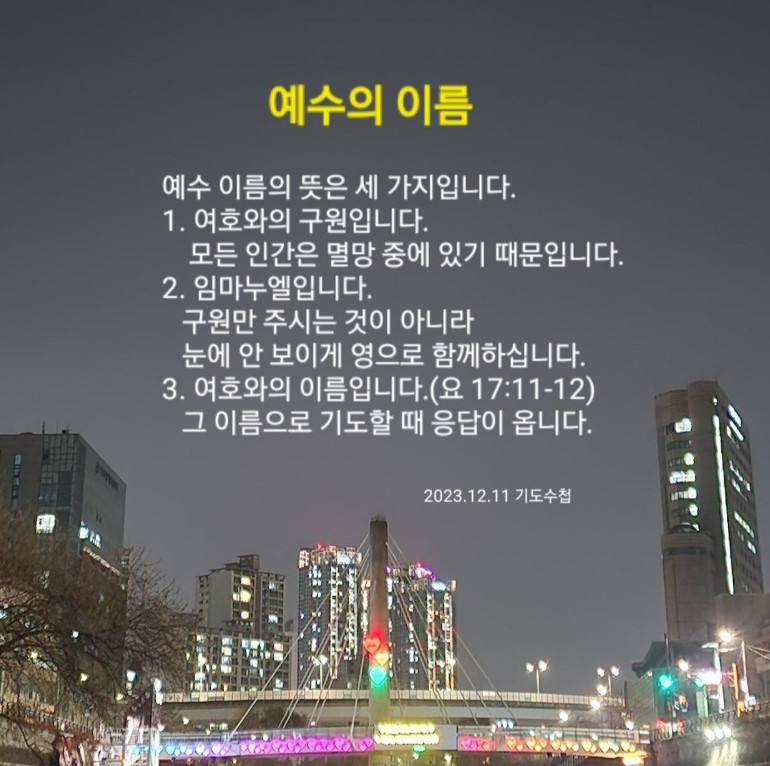 우리를 구원하신 하나님께 감사드립니다. 기도로 예수 이름의 능력을 누리게 하옵소서. 그 이름 앞에 하늘 군대가 동원되고, 사탄의 권세가 결박되며, 만물이 복종하는 것을 보게 하옵소서. 그 이름으로 구원의 역사가 오늘 우리의 현장에 나타나게 하옵소서. 예수 그리스도 이름으로 기도하옵나이다. 아멘.