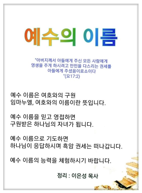 그래서 이 이름으로 지금도 역사하십니다. 예수 이름으로 구원받는 단계가 있습니다. 가장 먼저 아는 단계입니다.(사 53:3-6) 그리고 이 사실을 믿고 영접하는 단계입니다. 그러면 저절로 그리스도를 주로 시인하게 되고, 드디어 그 이름의 능력이 나타나게 됩니다.