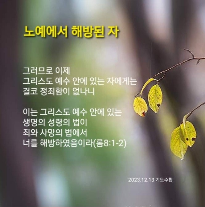 로마서 8:2 / 이는 그리스도 예수 안에 있는 생명의 성령의 법이 죄와 사망의 법에서 너를 해방하였음이라