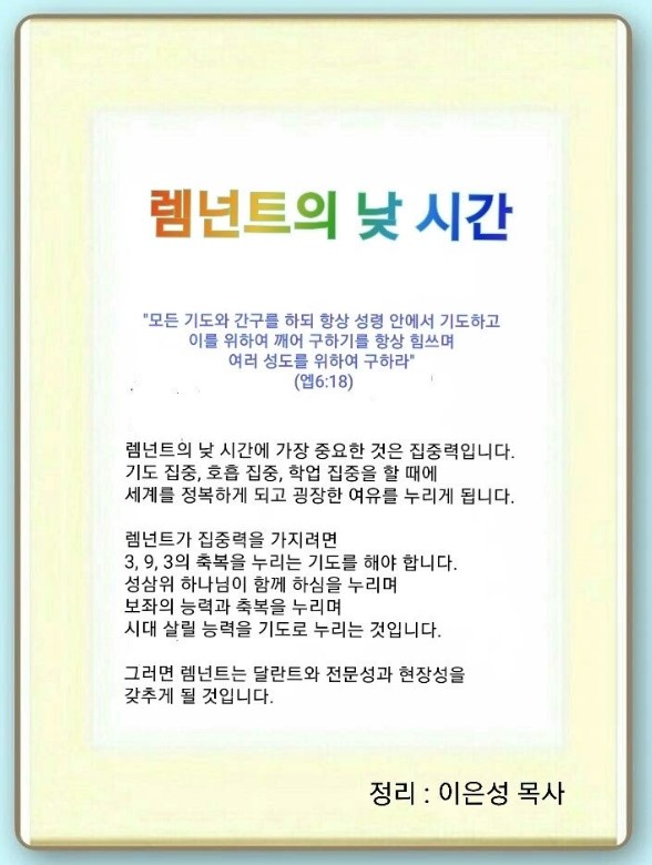 인터넷총국 (홈페이지 http://data.rutc.com) 후원: (국민은행) 856701-04-233309 (사)세계복음화전도협회 인터넷총국 분류 렘넌트전도학(2023-제123RUTC응답25)- 18 제목 렘넌트의 낮 시간 성경 에베소서 6:18 일