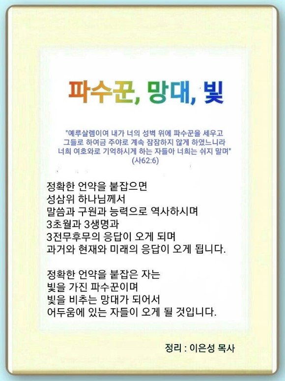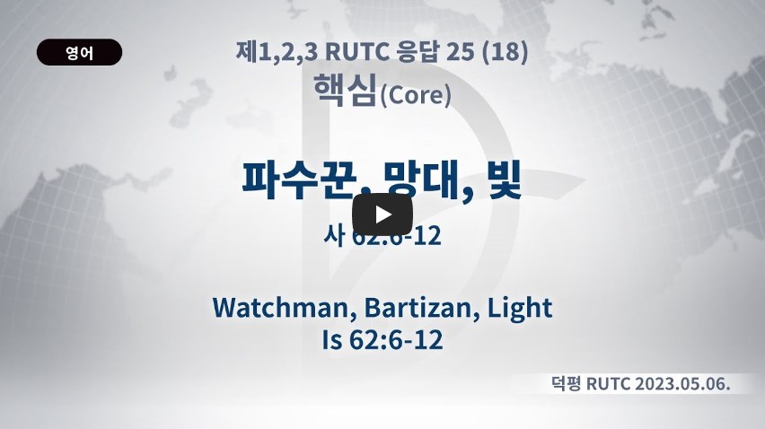 인터넷총국 (홈페이지 http://data.rutc.com) 후원: (국민은행) 856701-04-233309 (사)세계복음화전도협회 인터넷총국 분류 핵심훈련(2023-제123RUTC응답25)- 18 제목 파수꾼, 망대, 빛 성경 이사야 62:6-12 일시/장
