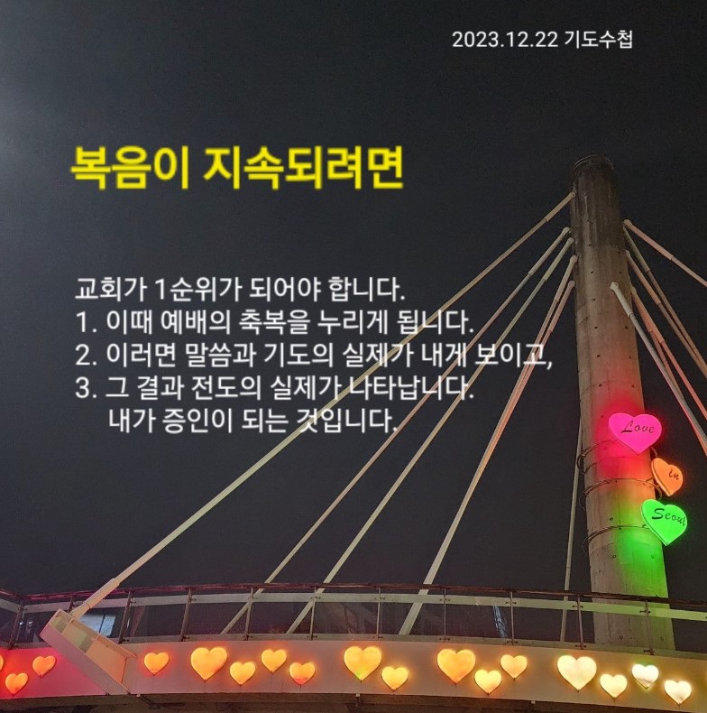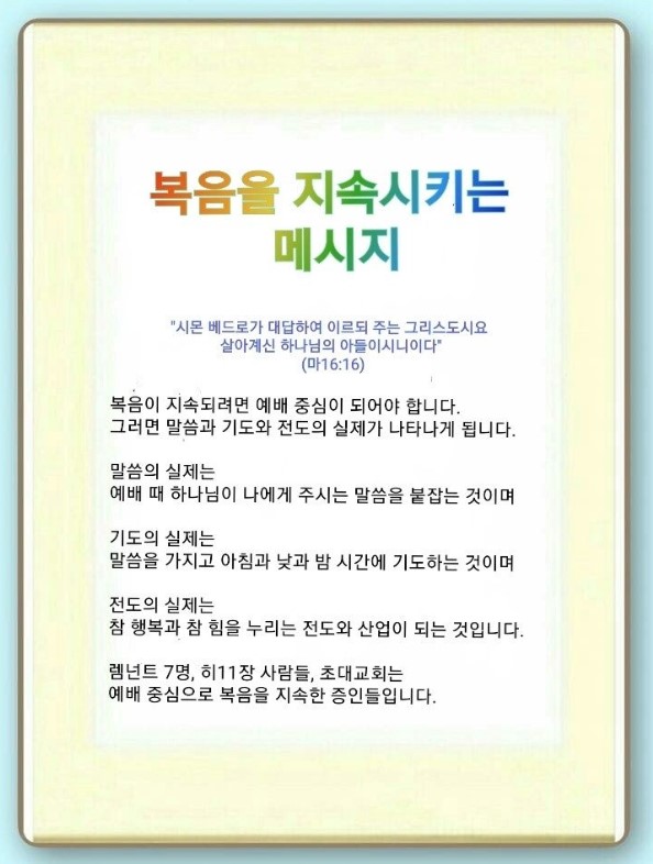 복음이 지속되려면 교회가 1순위가 되어야 합니다. 이때 예배의 축복을 누리게 됩니다. 이러면 말씀과 기도의 실제가 내게 보이고, 그 결과 전도의 실제가 나타납니다. 내가 증인이 되는 것입니다. 이 세 가지가 예배 때 주시는 말씀을 통해 하나로 연결되면 기도문으로 만들어집니다. 이 기도문을 가지고 아침에 기도하고, 낮에는 3‧9‧3 기도를 하며, 밤에는 한 단어를 붙잡고 기도하는 것입니다. 그때 이 말씀·기도·전도가 내게 각인·뿌리·체질이 되고, 24가 되면서 참된 행복과 참된 힘을 누리게 됩니다. 이러면 기도와 전도, 산업이 미리 보입니다. 신앙고백을(마 16:16) 했는데도 이 축복을 놓쳤기 때문에 복음 아닌 다른 것을 누리고, 지속이 안 되는 것입니다.(마 17:1-9)