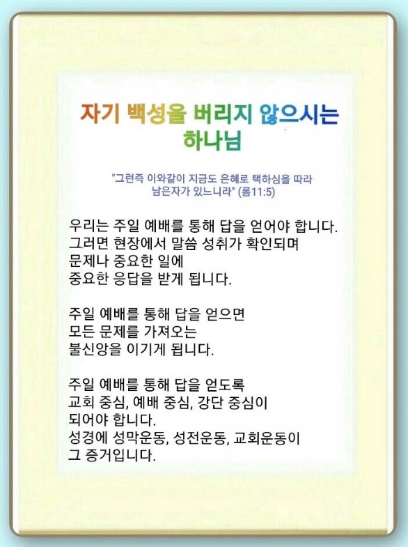 인터넷총국 (홈페이지 http://data.rutc.com) 후원: (국민은행) 856701-04-233309 (사)세계복음화전도협회 인터넷총국 분류 주일2부 예배- 2023년 제123RUTC응답 25 제목 (성전건축헌신) 자기 백성을 버리지 않