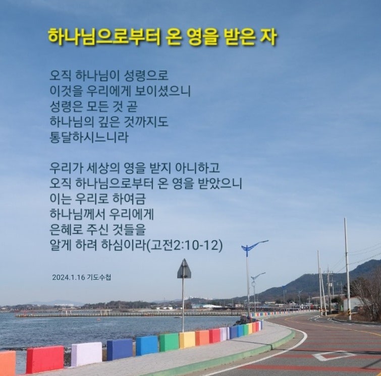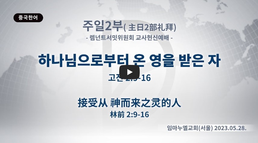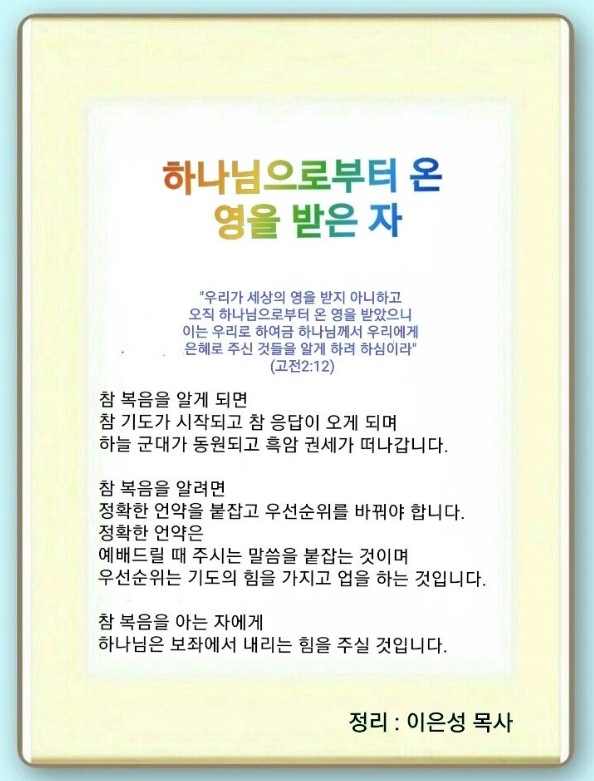 고린도전서 2:9-16 / 우리가 세상의 영을 받지 아니하고 오직 하나님으로부터 온 영을 받았으니 이는 우리로 하여금 하나님께서 우리에게 은혜로 주신 것들을 알게 하려 하심이라 (12)