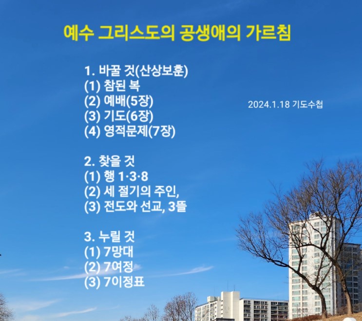 예수께서 공생애 동안 가르치신 것은 세 가지입니다. 첫째, 바꿀 것입니다. 예수께서는 산상보훈과(마 5:1-12) 천국의 의미(마 13:1-58), 복음의 본질을(마 16:13-20) 가지고 생각과 마음을 바꾸는 메시지를 주셨습니다. 또 오래된 것(마 17:19), 육신적인 것(마 18:1-10), 유대인의 안식일과 제도, 전통에 대한 잘못된 생각을 바꾸셨습니다. 그리고 부활 신앙을 강조하셨습니다. 둘째, 찾을 것을 가르치셨습니다. 예수께서는 1·3·8과 세 절기의 주인, 전도와 선교, 3뜰에 관한 메시지를 남기셨습니다. 이것을 찾아야 합니다. 셋째, 누릴 것을 가르치셨습니다. 하나님 나라입니다.(마 6:10, 10:7, 행 1:3) 바울이 이것을 제대로 붙잡고 전달했습니다.(행 19:8) 이것을 알고 예수께서 말씀하신 우리의 신분과 권세를 누려야 합니다.