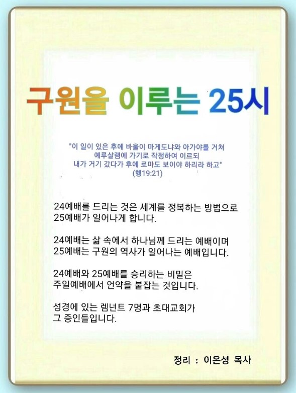 구원을 이루는 25시(행 19:21) → 롬 12:1-2 「산 제사」(산 예배) 구원을 이루는 25시, 여기에 성경 구절을 보면 바울이 “로마도 보아야 하리라.” 그랬 다. 이게 성취되어서 로마에 복음운동이 일