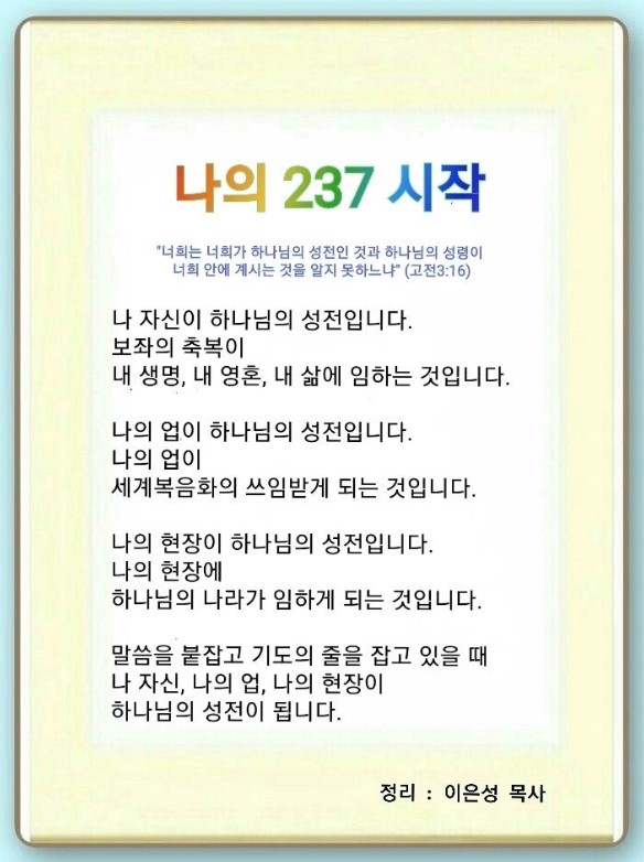 세상에는 구원받은 자와 구원받지 못한 자가 있습니다. 구원받은 자는 하나님이 주신 것으로 살게 됩니다. 이 사람에게는 237의 응답이 옵니다. 하나님은 처음부터 아브라함에게 네 씨로 말미암아 열방이 복을 받을 것이라고 하셨습니다. 7재앙을 막을 수 있는 응답을 주신 것입니다. 이 언약을 붙잡는 순간 성삼위 하나님이 말씀과 구원, 능력으로 역사하십니다.(마 28:19, 행 1:11, 27:24) 237의 언약을 붙잡는 사람에게 보좌의 축복을 약속하셨습니다. 기도할 때 시공간 초월의 역사가 일어나고, 업이 237로 바뀌게 됩니다. 하나님은 237나라의 재앙을 막고 그들을 살려내도록 우리에게 성전의 축복을 주셨습니다.