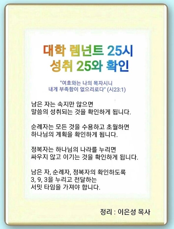 인터넷총국 (홈페이지 http://data.rutc.com) 후원: (국민은행) 856701-04-233309 (사)세계복음화전도협회 인터넷총국 분류 2023 제123RUTC 응답25- 세계대학수련회 제목 2강: 성취25와 확인 성경 시편 23:1-6 일시