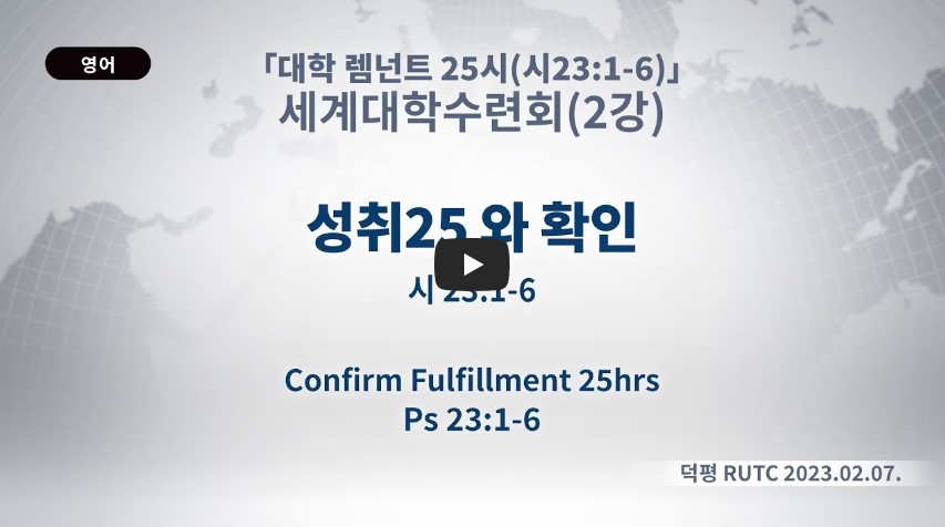 인터넷총국 (홈페이지 http://data.rutc.com) 후원: (국민은행) 856701-04-233309 (사)세계복음화전도협회 인터넷총국 분류 2023 제123RUTC 응답25- 세계대학수련회 제목 2강: 성취25와 확인 성경 시편 23:1-6 일시