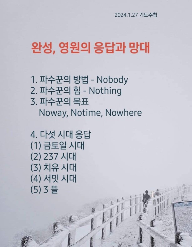 파수꾼의 목표는 Noway, Notime, Nowhere입니다. 그래서 다윗은 성전 준비를 했습니다.(대상 29:10-14) 이동하는 성막, 모이는 성전, 전 세계로 흩어지는 교회를 이해하면 모든 것이 됩니다.