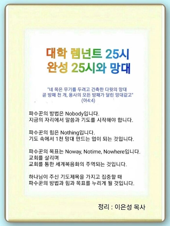 눈에 안 보이는 Tacit Power를(암묵적인 힘) 갖춰야겠습니다. 이것을 위해 다윗이 일천 망대와 성전을 준비했듯이 우리는 25 망대를 만들어야겠습니다. 25 망대라는 것은 반대쪽부터 살리는 '플랫폼'과 빛을 비추는 시스템인 '파수망', 치유의 소통을 이루는 '안테나'를 말합니다. 이 망대를 준비하려면 책과 말씀으로 계속 편집해야 됩니다. 이때 나오는 답을 가지고 기도로 설계하고, 이 속에서 오는 응답으로 237에 적용하는 디자인을 하면 됩니다. 무엇보다 망대를 만들 때 중요한 것이 '원니스'입니다. 먼저 보좌와 내 생명(창 1:27), 영혼(창 2:7), 현장이(창 2:18) 원니스 되어야 합니다. 또한 내 생각과 마음, 영혼, 뇌, 영원한 것이 원니스 되어야 합니다. 그리고 과거와 현재, 미래를 원니스로 누려야 합니다. 이것이 진정한 기도이며, 이때 5력이 생겨납니다. 이제 망대를 만드는 시간표를 가져야 됩니다. 여기에 이유없이 24하면 됩니다. 그러면 모든것을 초월하는 25가 되고, 영원의 작품이 나오게 됩니다. 이런 망대의 파수꾼이 되어야겠습니다.