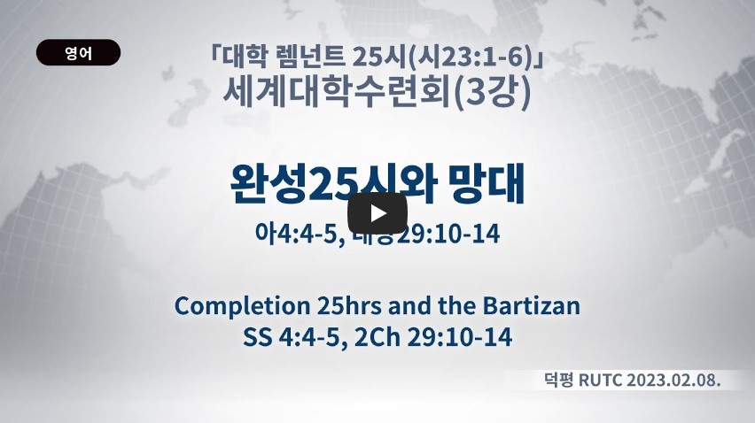 인터넷총국 (홈페이지 http://data.rutc.com) 후원: (국민은행) 856701-04-233309 (사)세계복음화전도협회 인터넷총국 분류 2023 제123RUTC 응답25- 세계대학수련회 제목 3강: 완성 25시와 망대 성경 아가서 4:4-5,